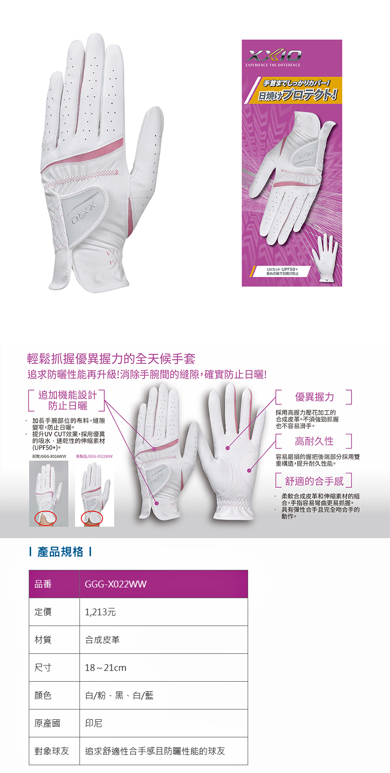 Dunlop XXIO GGG-X022W 高爾夫手套 羊皮手套 女仕 單只手套 左手 全天候適用 UPF50+防曬機能設計 優異抓握力 耐用耐磨損 舒適合手感 白粉色 25 NEW