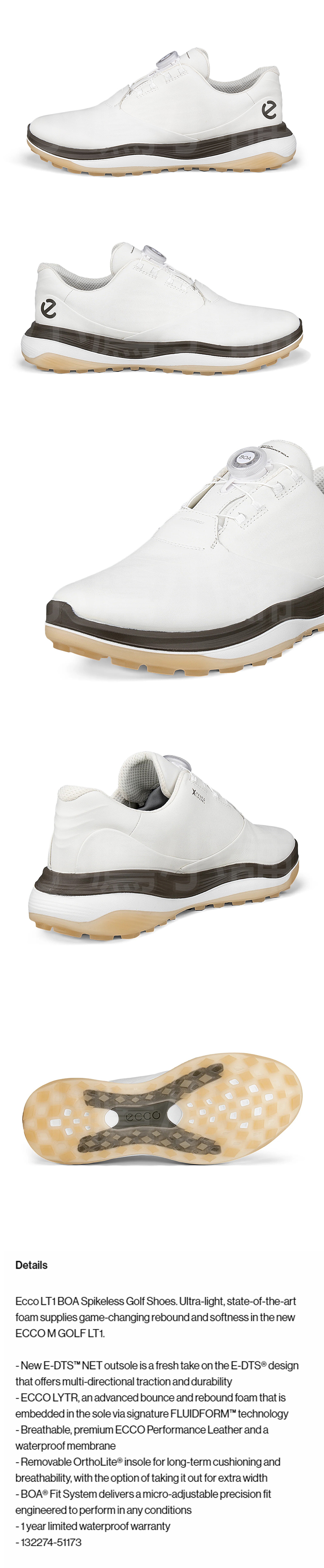 ECCO LT1 BOA 132274 51173 高爾夫 球鞋 運動鞋 男仕 無釘 BOA旋扣式鞋帶 透氣防水皮革 柔軟彈性泡棉 提供多向抓地力 白/咖啡色 25 NEW