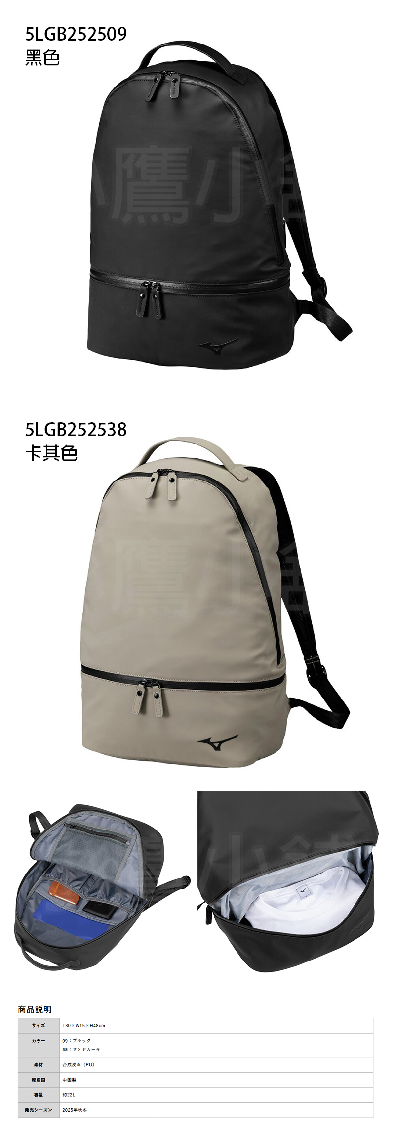 Mizuno 5LGB2525 美津濃 高爾夫 背包 運動包 男女適用 底部衣物收納隔層 多收納袋設計 合成皮革 黑色、卡其色 兩色 25 NEW