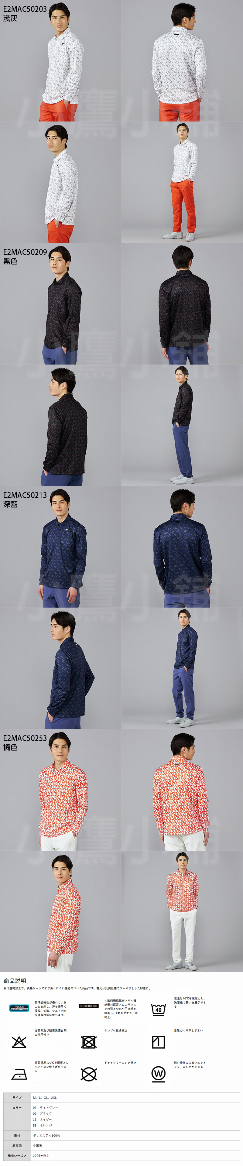 Mizuno E2MAC502 美津濃 高爾夫 長袖POLO衫 長袖襯衫 吸汗速乾 透氣舒適 防止悶熱感 適合秋冬 印花圖案 100%聚酯纖維 四色 25 NEW