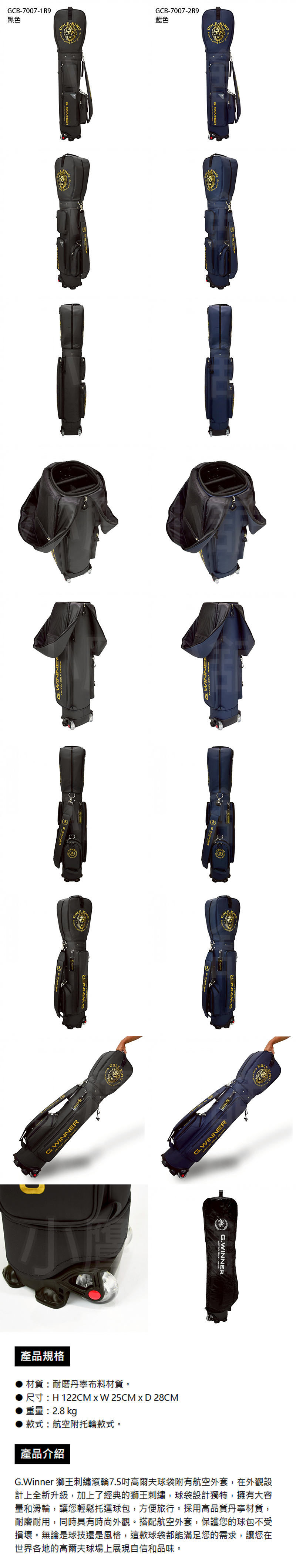 ARTINN GCB-7007 G.Winner 獅王刺繡滾輪7.5吋高爾夫球袋 附航空外套 有輪桿袋 輪式球袋 大容量空間 耐磨布料材質 附出國外袋 黑、藍 兩色 25 NEW