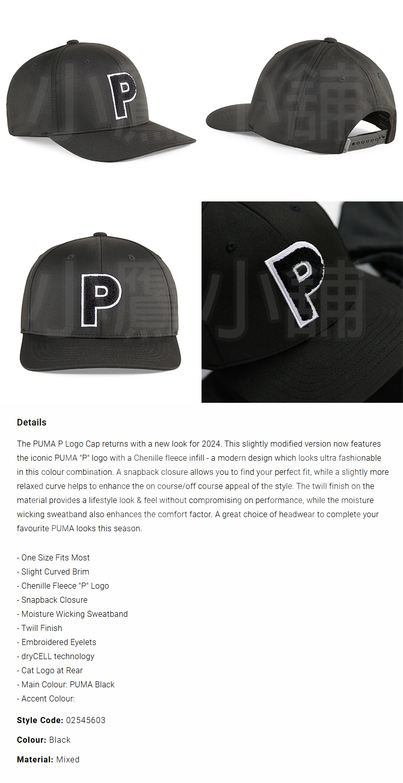 PUMA 02545603 高爾夫 球帽 絨繩P棒球帽 運動帽 LOGO立體刺繡 吸濕排汗帶 刺繡透氣孔 斜紋布料 尺寸可調節扣帶 黑色 25 NEW