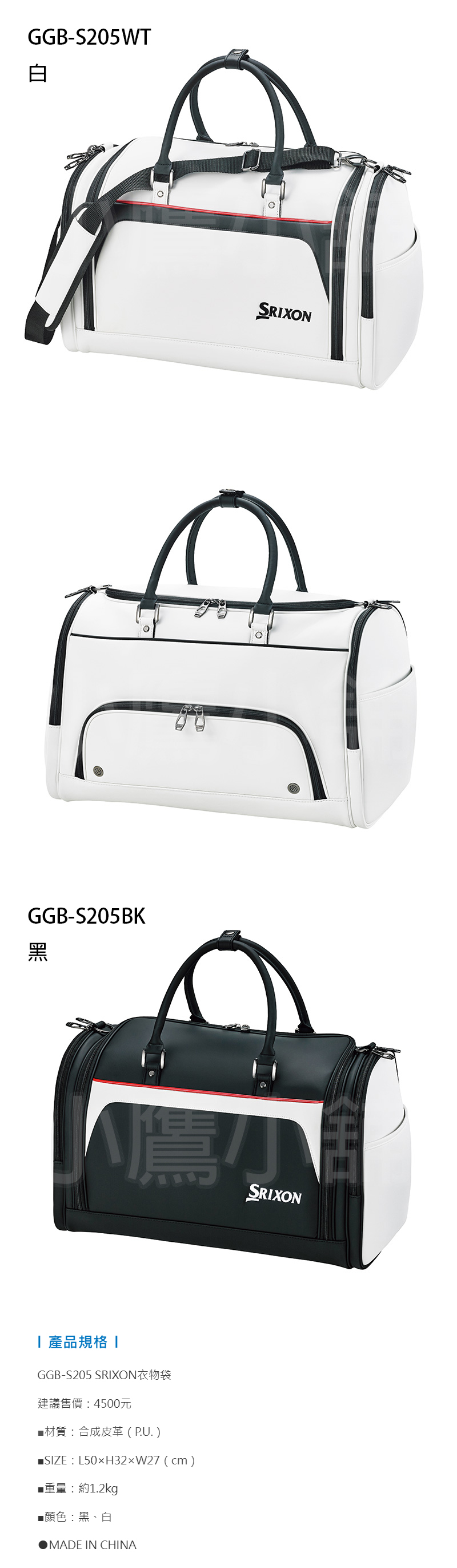 Dunlop SRIXON GGB-S205 高爾夫 衣物袋 大收納空間 可拆卸肩背帶 置鞋空間 可置一雙鞋 PU合成皮革 白、黑 兩色 25 NEW