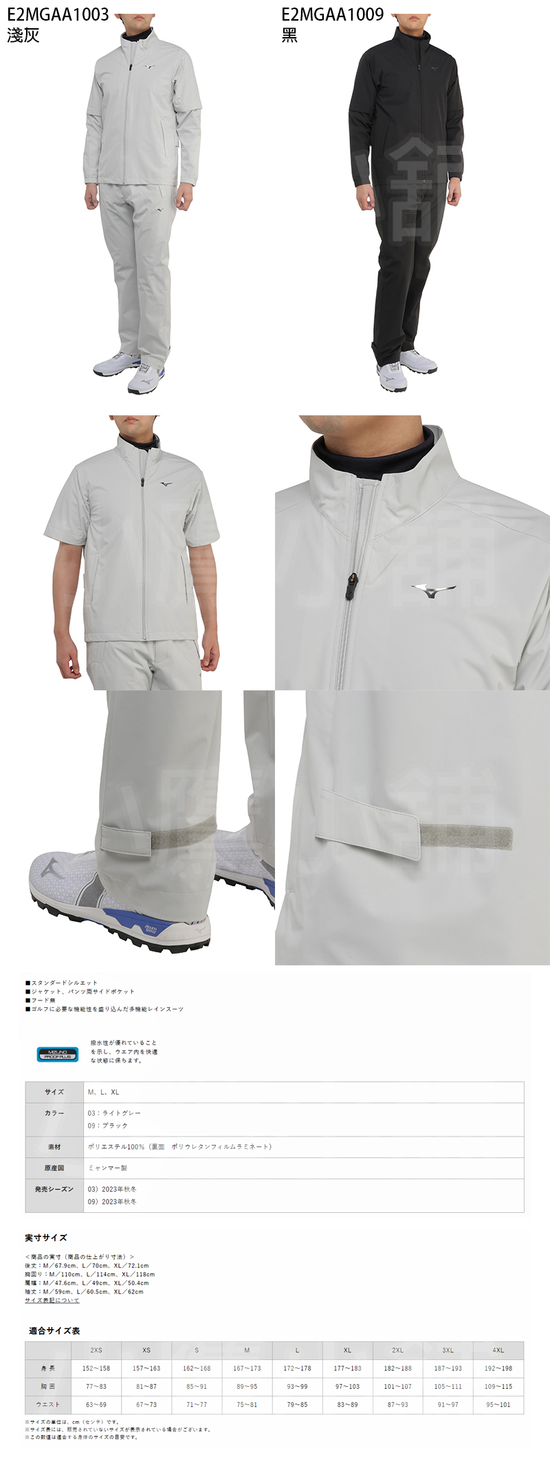 Mizuno E2MGAA10系列 美津濃 高爾夫雨衣 男仕雨衣套裝 雨衣+雨褲 通風透氣 防水係數超過15000mm 出色防水性 袖子可拆卸 腰部和腿部可調節魔鬼氈 淺灰、黑 兩色