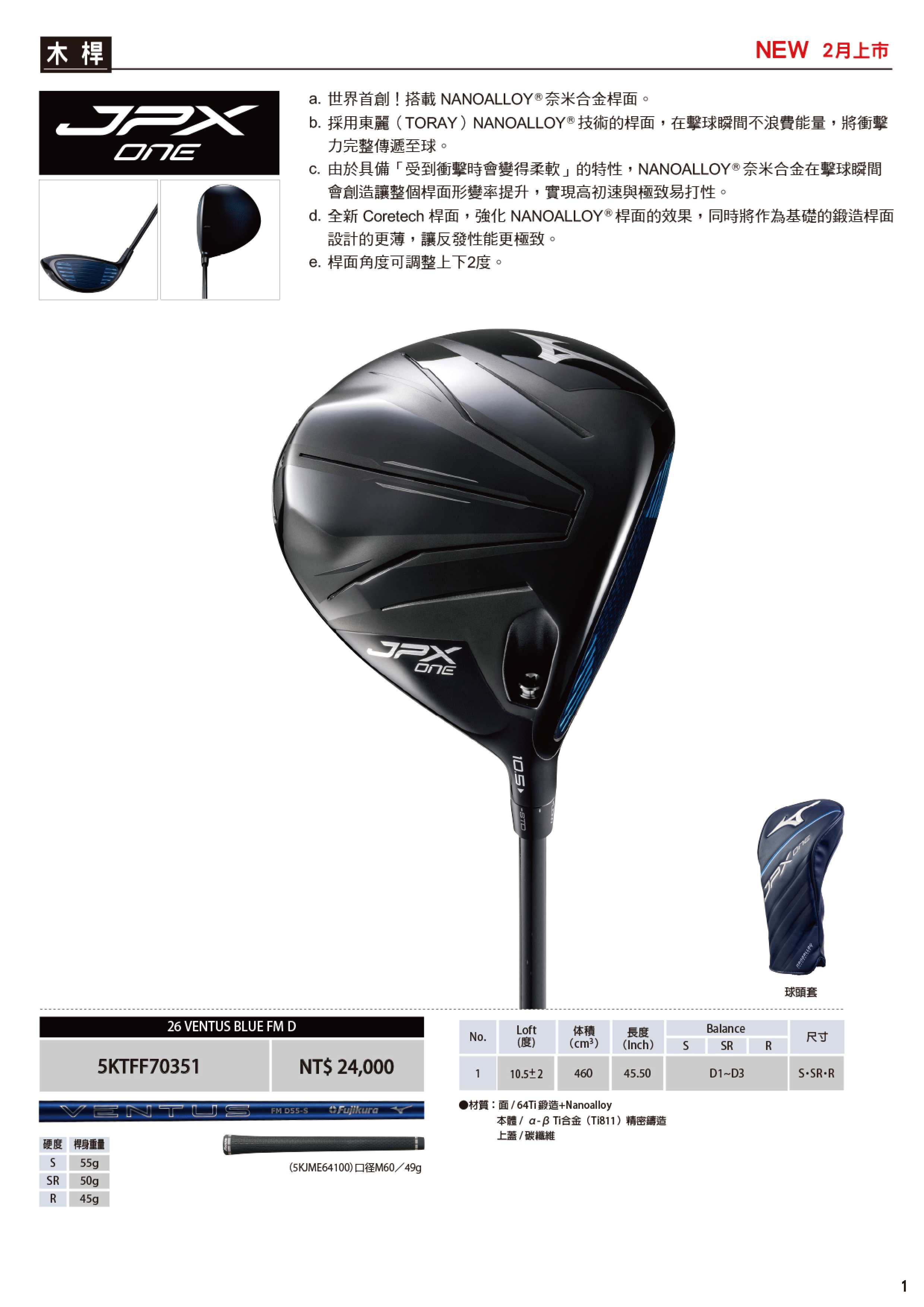 Mizuno JPX ONE Driver 美津濃 高爾夫 開球木桿 OEM桿身 首款採用奈米合金材質 受到衝擊時更柔軟 具高初速與容錯 更低更深的重心設計 26 NEW