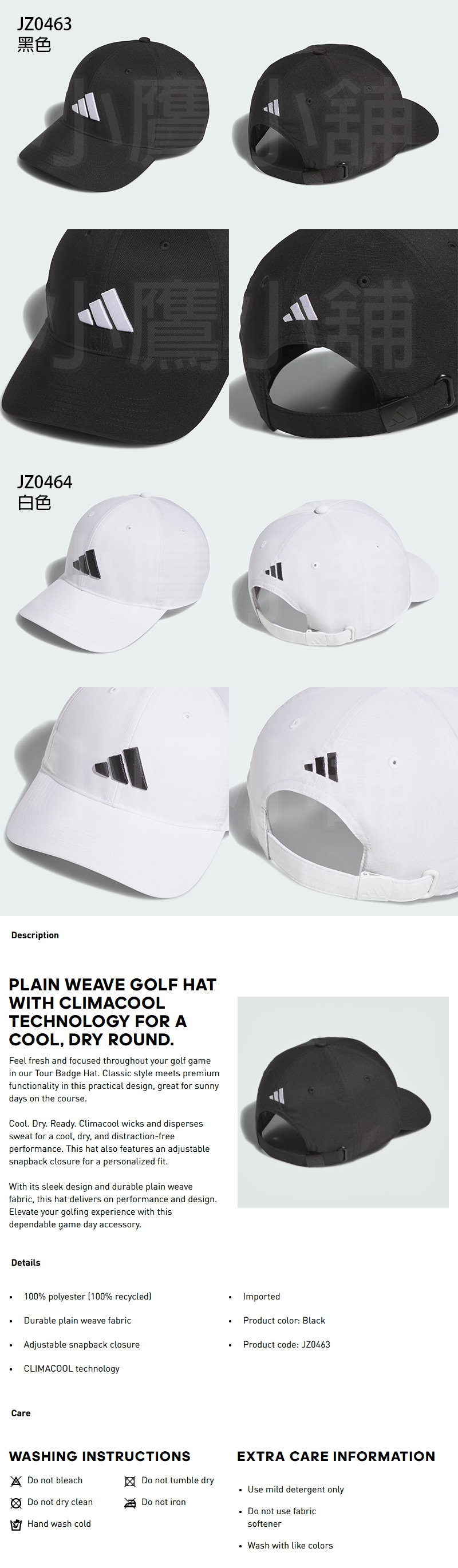 Adidas JZ0463 JZ0464 阿迪達斯 高爾夫 運動帽 球帽 男女適用 CLIMACOOL涼感技術 吸濕排汗 涼爽舒適 頭圍尺寸可調節 100%聚酯纖維 兩色 26 NEW
