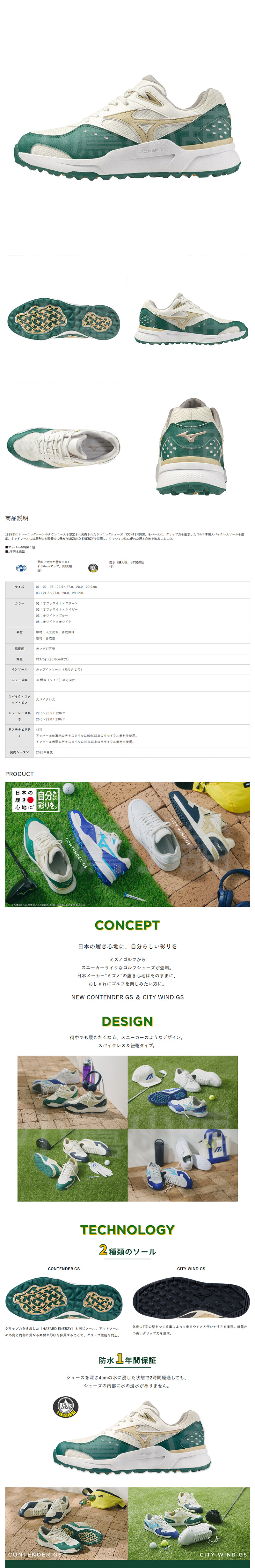 Mizuno 51GM262101 CONTENDER GS 美津濃 高爾夫球鞋 運動鞋 男仕 無釘 寬楦(3E) 防潑水鞋面 彈性輕盈 卓越抓地力 米白色/綠色 26 NEW