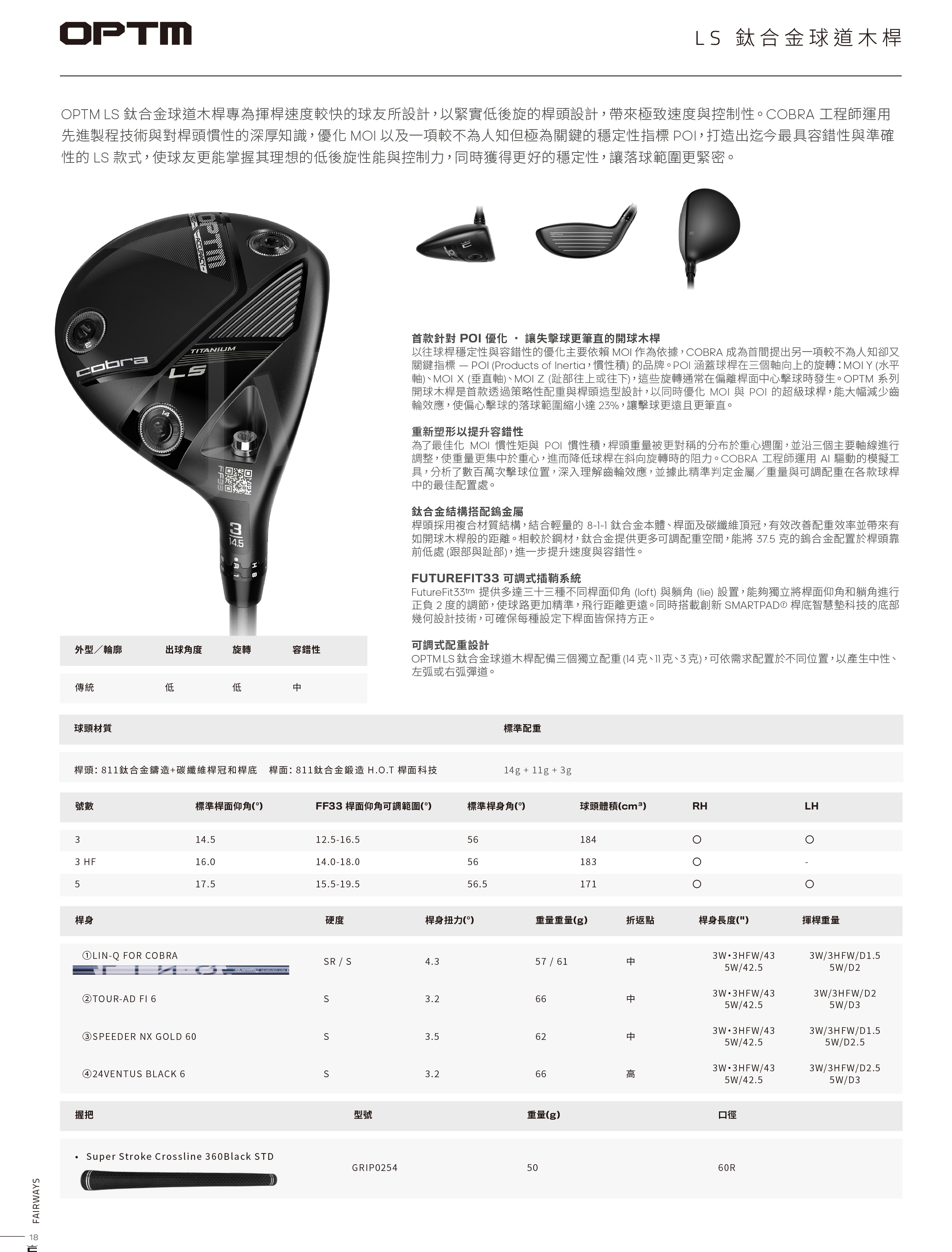 Cobra OPTM LS Titanium Fairway 高爾夫 LS鈦合金球道木桿 首款針對POI(慣性積)優化木桿 提升容錯性 可調節仰角與躺角 低後旋 高控制性 26 NEW
