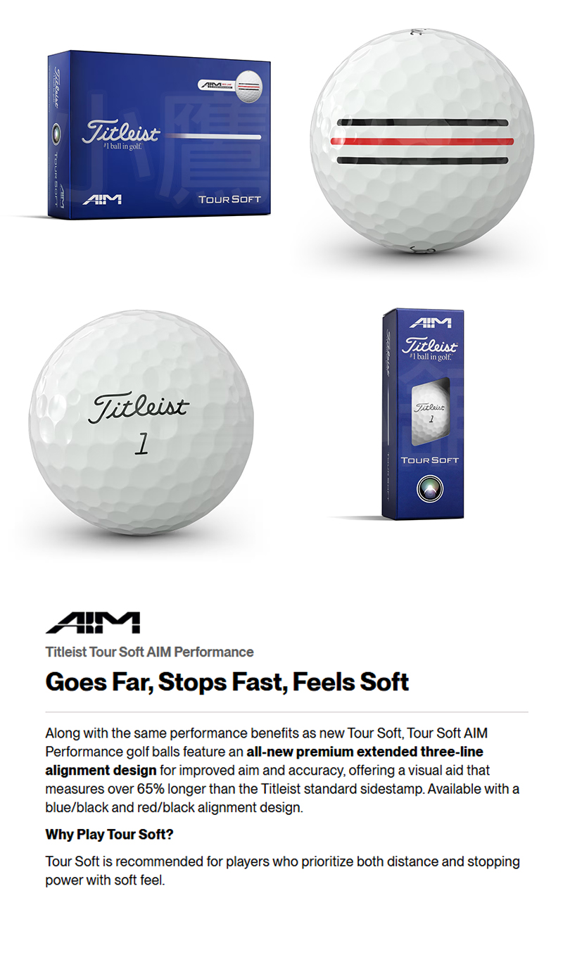 Titleist Tour Soft Red AIM 高仕利 高爾夫球 二層球 白球 瞄準線球 瞄準線加長 三條線設計 紅線 增強對齊 更精確停球控制 長距離飛行 柔軟擊球手感 26 NEW