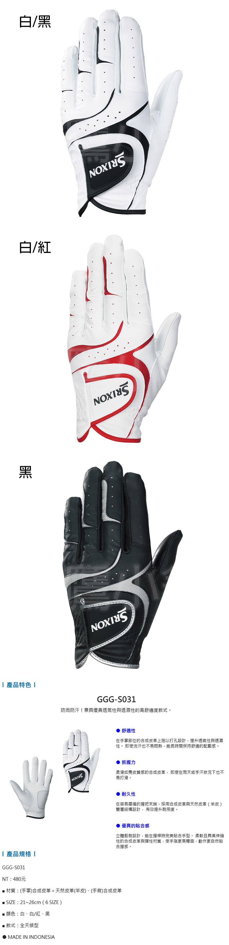 Dunlop SRIXON GGG-S031 高爾夫 男仕 手套 選手款手套 全天候型手套 防雨防汗 透氣透濕 柔軟貼合 耐磨損設計 三色 26 NEW
