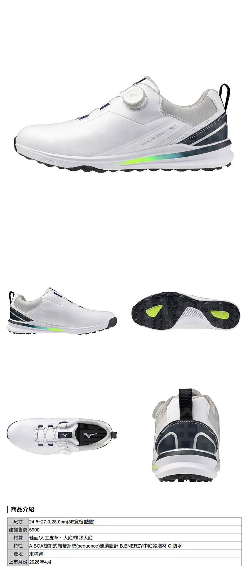 Mizuno 51GM265101 美津濃 高爾夫球鞋 運動鞋 男仕 無釘 寬楦(3E) 防水鞋面 BOA旋扣式鞋帶系統 ENERZY中底發泡材質 26 NEW