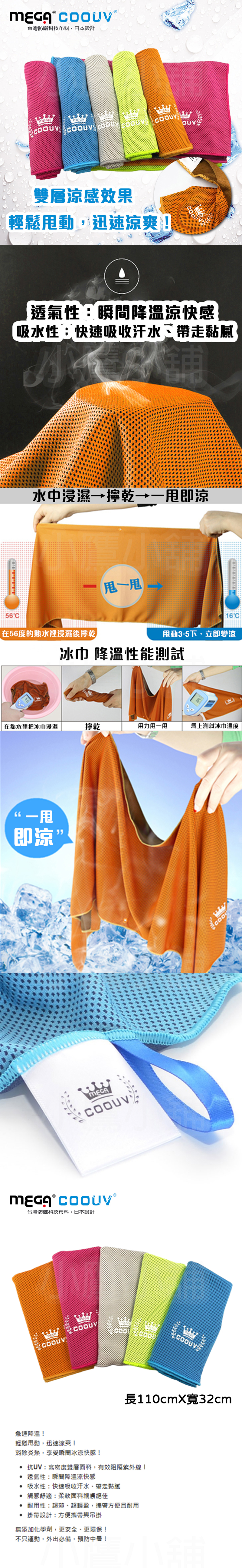 [日本樂天銷售冠軍] MEGA UV-002 高爾夫 高效冷卻雙面冰涼巾 運動冷感冰巾 抗UV 冷感降溫 清爽吸汗 藍/橘/灰 '21 NEW