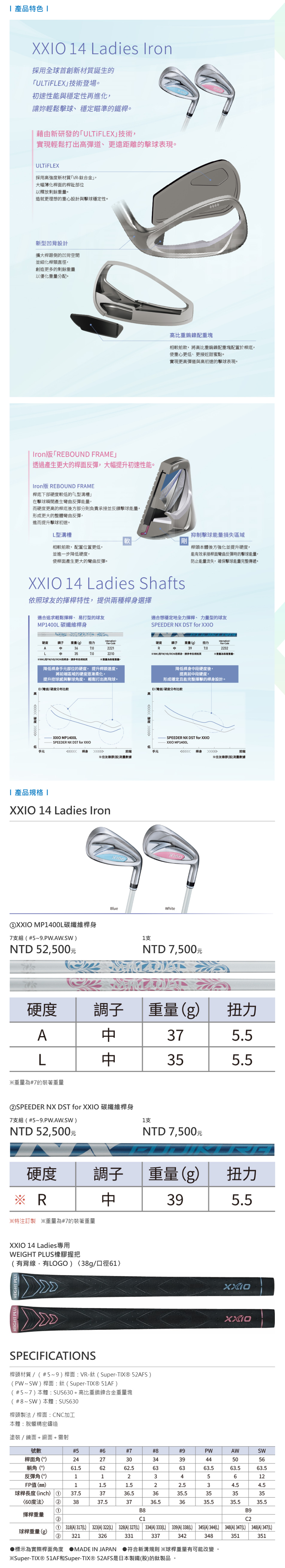 [女仕] Dunlop XXIO XXIO 14 MP1400 Ladies Iron 高爾夫 鐵桿組 全新ULTiFLEX科技 新型凹背設計 高比重鎢鎳配重塊 提高初速性能與穩定性 I6-9、P、A、S 共7支 25 NEW