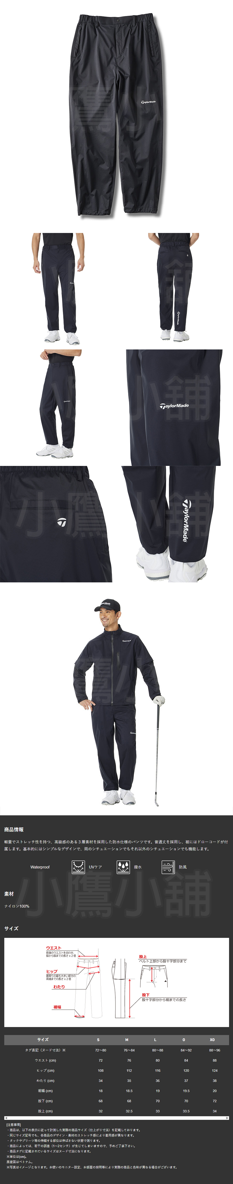 TaylorMade TL783 M24135 泰勒梅 高爾夫 男仕 雨褲 防水長褲 防風防水 抗UV紫外線防護 輕盈彈性 腳踝鬆緊帶設計 100%尼龍 黑色 26 NEW