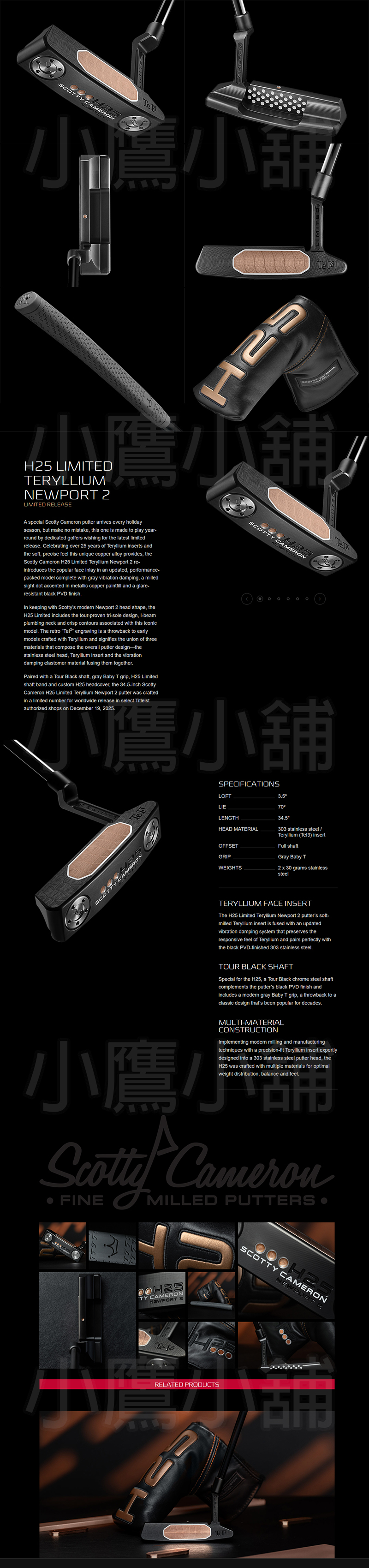 [黑色限量] Titleist Scotty Cameron H25 Limited Teryllium Newport 2 高爾夫 推桿 不鏽鋼桿頭 銅合金桿面嵌件 避震彈性體材料 防眩光黑色PVD塗層 26 NEW