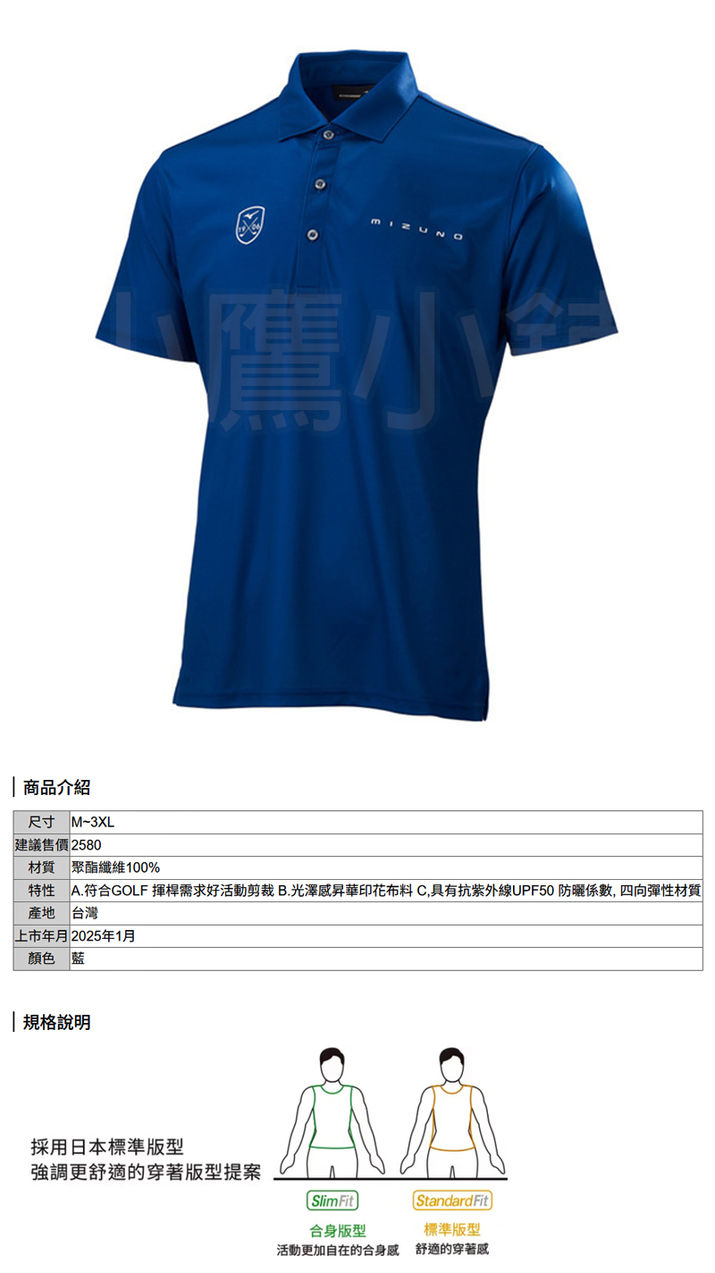Mizuno E2TAC00120 美津濃 高爾夫 短袖POLO衫 短袖上衣 男仕 方便活動剪裁 光澤感印花布料 UPF50防曬係數 防曬抗紫外線 四向拉伸彈性材質 藍色 26 NEW